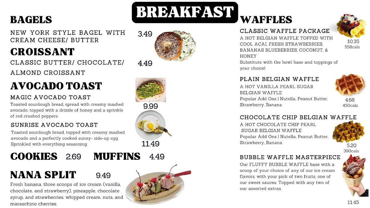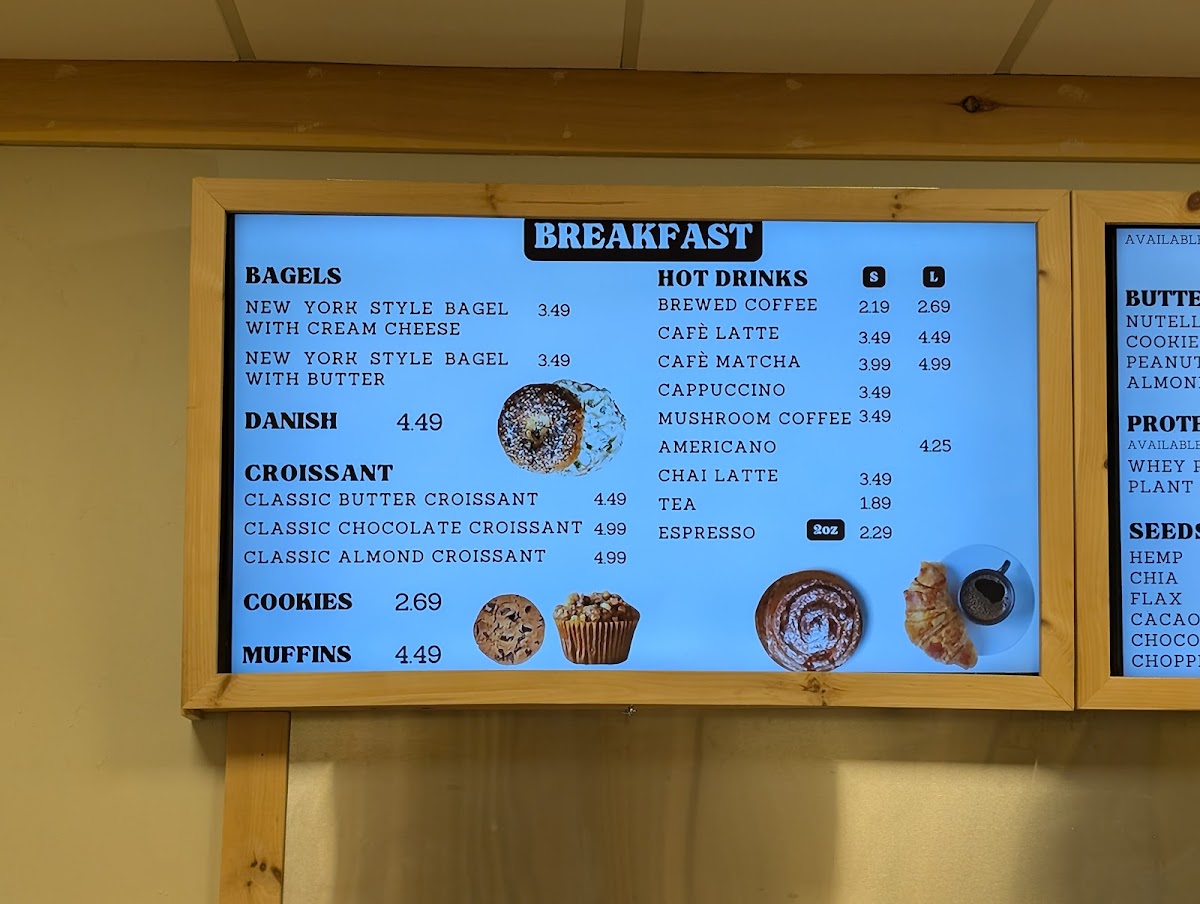 This menu is structured to accommodate quick orders or casual dining experiences, providing options for breakfast, coffee breaks, and light meals throughout the day.